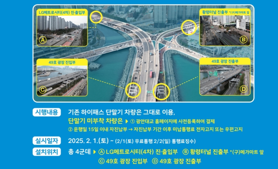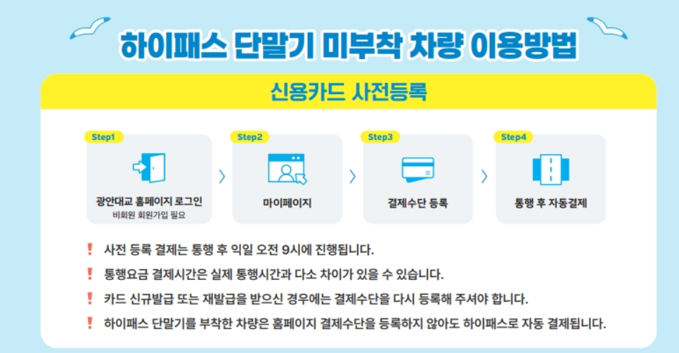 - 하이패스 미부착 차량: 사전등록 후 매일 오전 9시에 자동 결제.