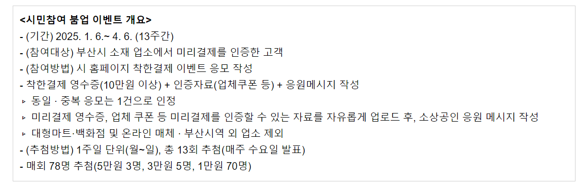 시민참여 붐업 이벤트는 부산 시민들이 착한결제에 직접 참여하도록 독려하기 위해 마련되었습니다. 이벤트는 2025년 1월 6일부터 4월 6일까지 13주 동안 진행되며, 부산시 소재 업소에서 미리 결제한 금액과 인증자료를 통해 응모할 수 있습니다.