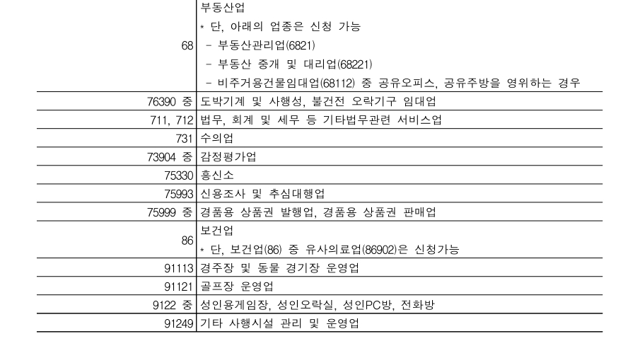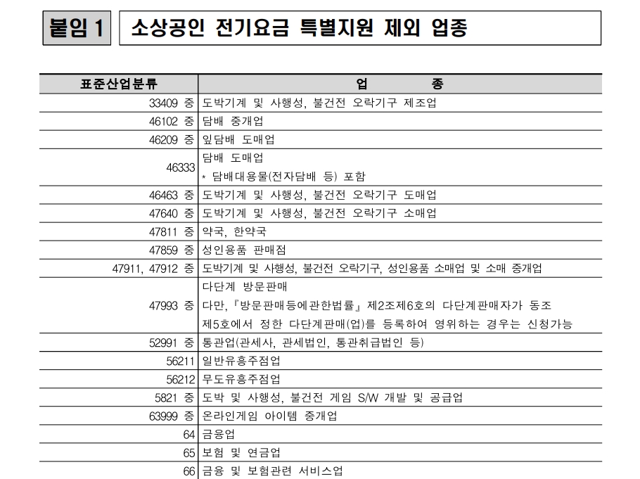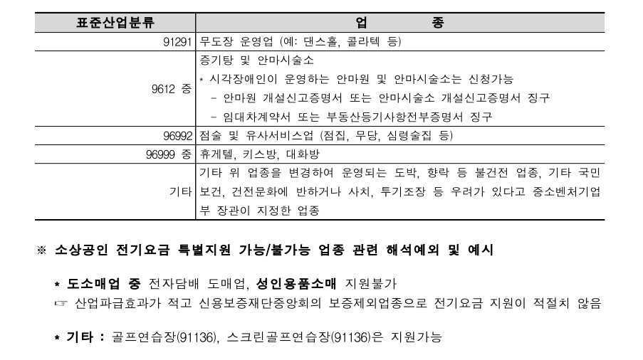 ☞ (업종 제한) 연매출 6천만 원 초과 소상공인 중 「소상공인 전기요금 특별지원 제외 업종」은 지원 제외(마지막 부분 참조)