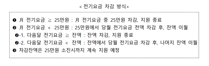 - 지원방식 : 대상자 통보 후 최초발행되는 전기요금 고지서 상 청구되는 전기요금부터 최대 25만 원 차감