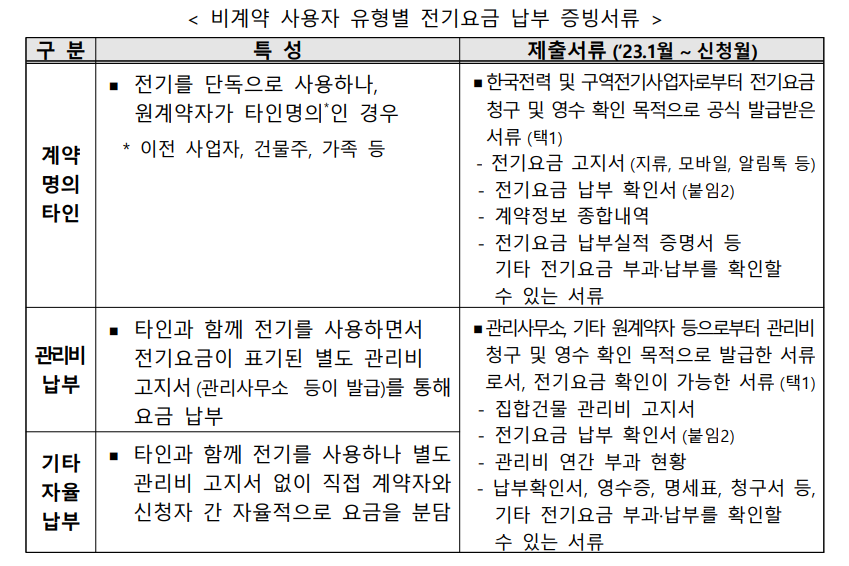 - 제출서류 : 신청자 정보 입력, 유형별 전기요금 납부 증빙서류
