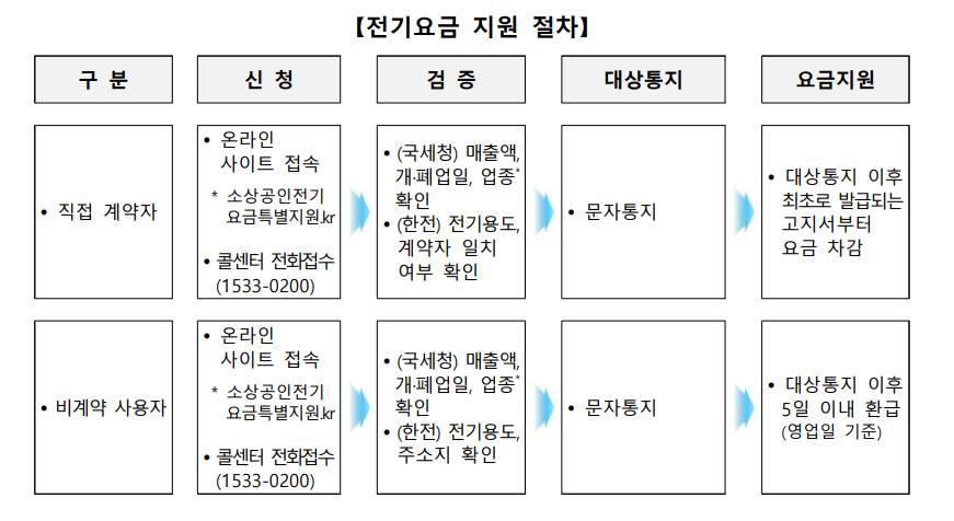 ⑥ 제출서류 보완요청에도 불구하고 요청기간 내 증빙(전기요금 납부 증빙서류, 업종확인 서류 등) 미보완 시 지원에서 제외될 수 있습니다.