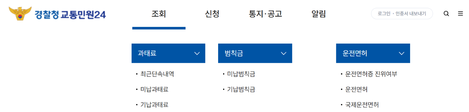 - 신청 및 납부 : 과태료나 범칙금을 납부할 때는 '신청' 메뉴를 통해 간편하게 진행할 수 있습니다.